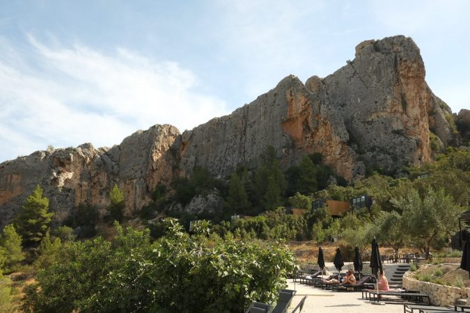 Con vistas al mar Mediterráneo y en plena sierra Tramontana, zona declarada patrimonio de la humanidad por la UNESCO. Concretamente, el complejo hotelero se ha construido en un acantilado. Eso le da a las habitaciones unas vistas increíbles a un pinar y a la costa.