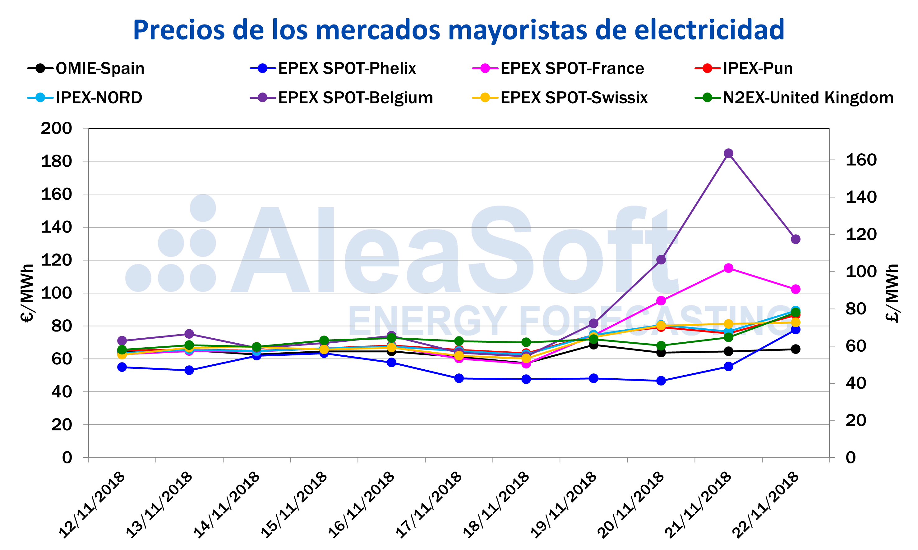 El resto de principales mercados europeos, Alemania registró para hoy, 22 de noviembre, su precio horario más alto desde el 25 de enero de 2017, 128,26 €/MWh, y un precio promedio de las 24 horas de 77,80 €/MWh. Mientras que el mercado ibérico en España, que en inviernos anteriores ha sufrido con las crisis nucleares de los países vecinos, en esta ocasión ha contenido sus precios e incluso para hoy, 22 de noviembre ha marcado el precio más bajo de todos los países analizados por AleaSoft, 65,89 €/MWh, con permiso del nórdico NordPool, claro está.