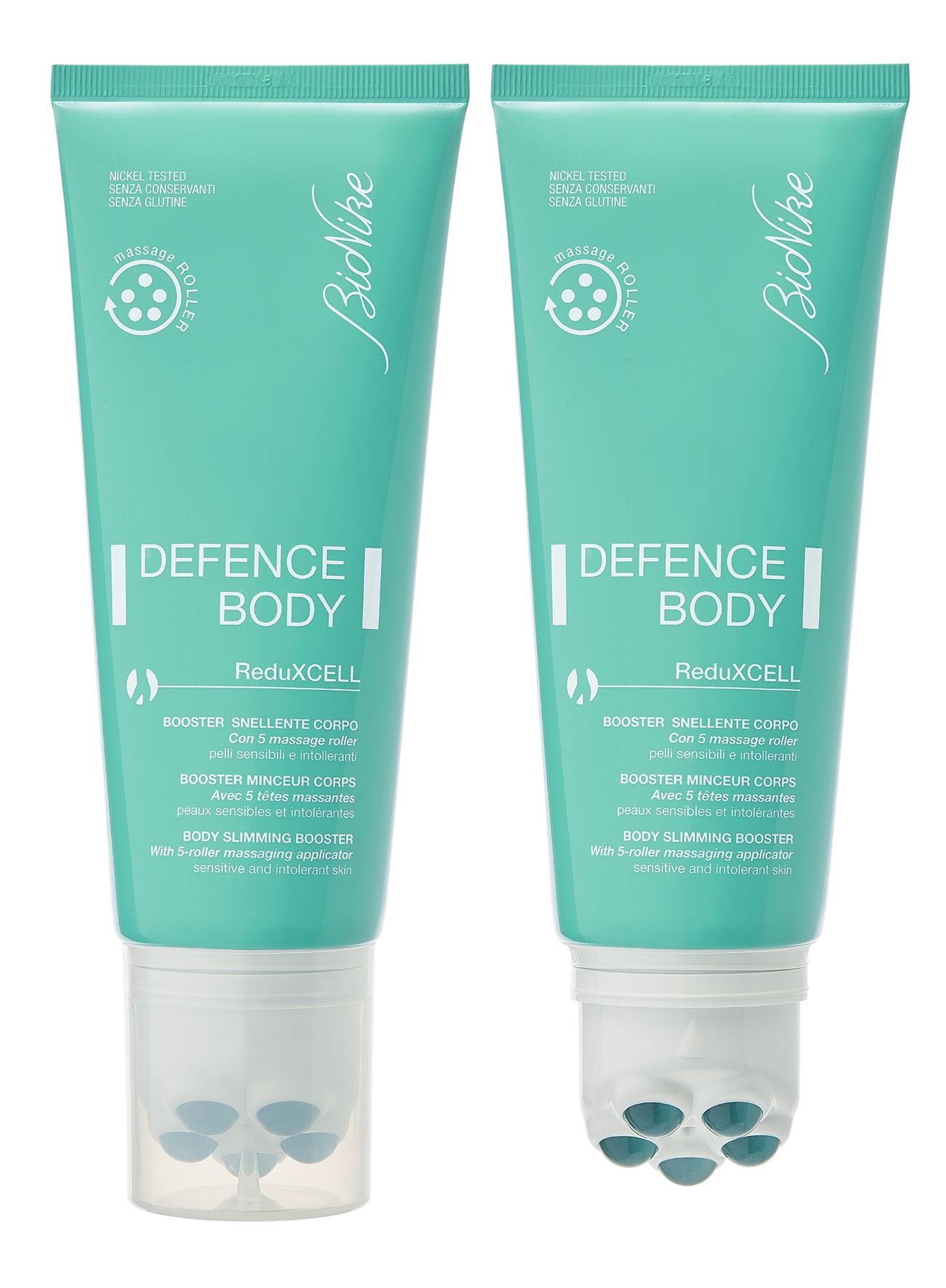 DEFENCE BODY REDUXCELL BOOSTER ADELGAZANTE CON RODILLO DE MASAJE (200ml): Emulsión de textura ligera y de rápida absorción estudiada para combatir los inestetismos de la celulitis. Favorece la uniformidad cutánea, mejorando visiblemente el aspecto de “piel de naranja”. Formulada con el exclusivo “AlgaForShape Complex” con una intensa acción lipolítica junto con el aplicador masajeador, contribuye a reducir las grasas almacenadas actuando contra la formación de nuevas acumulaciones adiposas. Sin cafeína. Contiene perfume libre de alérgenos.