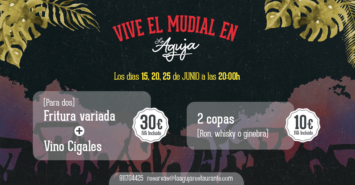 Hoy, en torno a las 20:00h, el Restaurante La Aguja en Las Tablas (Madrid) espera para dar el pistoletazo de salida de España en este Mundial de fútbol. Una alternativa para los amantes del deporte rey con la que podrán disfrutar de la emoción que supone el Mundial de Fútbol y de la mejor gastronomía de la zona.
