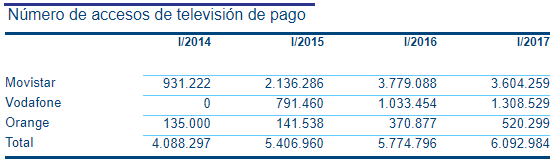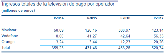 Aunque todo necesita su contexto. En primer lugar las globales que ofrece la Comisión Nacional de los Mercados y la Competencia (CNMC). Los ingresos de la televisión de pago crecieron un 15% en el primer trimestre del año. La televisión en abierto obtuvo 465 millones de euros, mientras que la televisión de pago 520 millones de euros. Asimismo, el total de abonados a final del primer trimestre de 2017 fue de algo más de 6 millones (6,09 millones), 31.000 abonados más respecto al trimestre anterior.