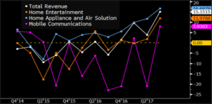 Según las estimaciones de Bloomberg, hay dos divisiones que están teniendo un gran comportamiento este ejercicio. Las ventas de electrodomésticos están en alza, así como el despacho de piezas de automóviles, un negocio en el que LG cada vez se consigue mayor cuota de mercado y confianza por parte de los fabricantes. Tanto, que la estimación de crecimiento es del 30% anual hasta 2020, siendo muy importante las sinergias que tiene en estos momentos con Chevrolet.