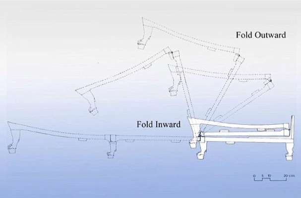 Dada la forma elaborada de la ata de madera, doblar la cama no era nada sencillo, y los diseñadores tuvieron que utilizar bisagras de un estilo ingenioso sobre las patas.