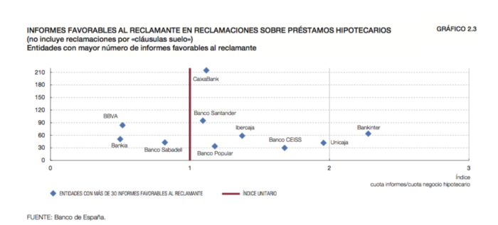 Bankinter es el banco que peor lo está haciendo. Presenta un mayor ratio de quejas e informes favorables al cliente sobre lo que debería ser su cuota de mercado. Le siguen Unicaja, CEISS, Ibercaja, Popular, Santander y Caixabank. En el lado contrario, los que mejor lo hacen en este caso son Bankia y BBVA.