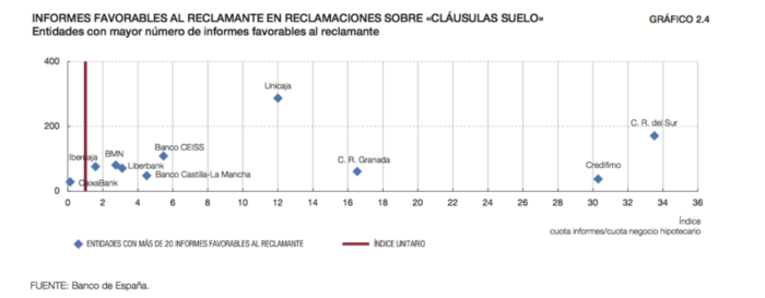 Ahora bien, no todos los bancos tienen el mismo comportamiento. Según los datos del Banco de España se puede observar que hay grandes diferencias entre unos y otros. Los que más han visto afeada su conducta por el regulador son Ibercaja -a la que el regulador le ha dado la espalda en el 77% de los casos- seguida de Unicaja (76%), Liberbank (75,8%) y Banco Castilla La Mancha (74,5%). Sin embargo, la palma se la llevan la Caja Rural del Sur -que se ha llevado un varapalo del BdE en el 87% de las ocasiones, seguida de la Unión de Créditos Inmobiliarios (85,7%)-.