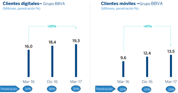 Un aumento de los clientes que va unido a un incremento de la actividad tanto a través del ordenador como del móvil gracias a las apps con las que cuentan los bancos. Por ejemplo; las ventas digitales de BBVA se han incrementado en estos tres primeros meses del año desde el 17,1% hasta el 24% del total, mientras que en Santander los accesos a la banca digital aumentan un 34% y las transacciones monetarias lo hacen un 31%, con respecto al primer trimestre de 2016.