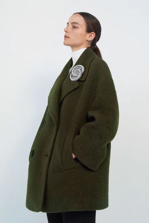 El primer abrigo de la lista es este oversize con lana de color khaki o de color visón. Se trata de una prenda corta con manga larga y solapa. Asimismo, tiene bolsillos delanteros de vivo, cierre frontal cruzado y botones combinados a contraste.
